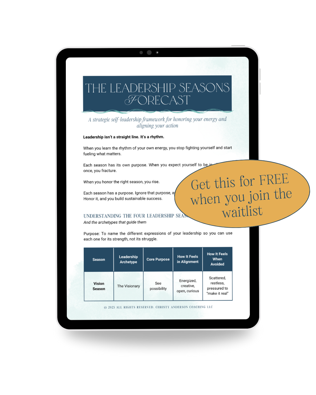 As a thank-you for joining the waitlist, you’ll immediately receive a complimentary copy of the Leadership Seasons Forecast, Christy’s powerful self-leadership worksheet to help you: